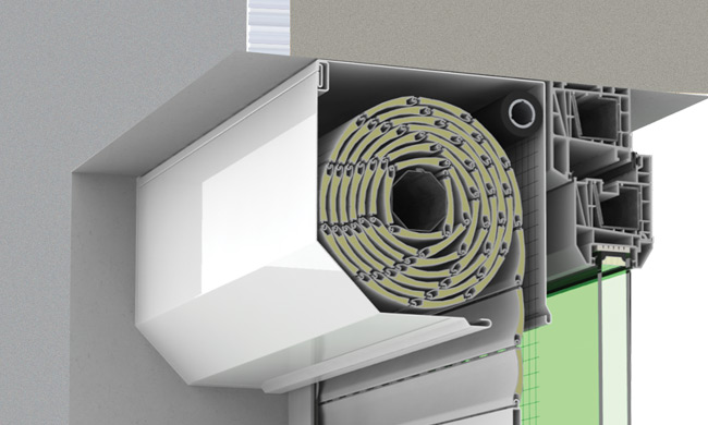 Rulou pentru fereastră aplicat - OUTBOX cu casetă semirotundă și plasă de insecte integrată